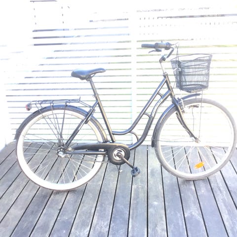 Crescent damcykel av typen övriga cyklar med ramstorlek XL och 28" hjul. Cykeln har låg instegsram anpassad för kvinna. Utrustad med framkorg, pakethållare bak, kedjeskydd och stänkskärmar. Färg i brun ton med ljusa däckkanter. Lämplig för vardagscykling och transporter i stadsmiljö.