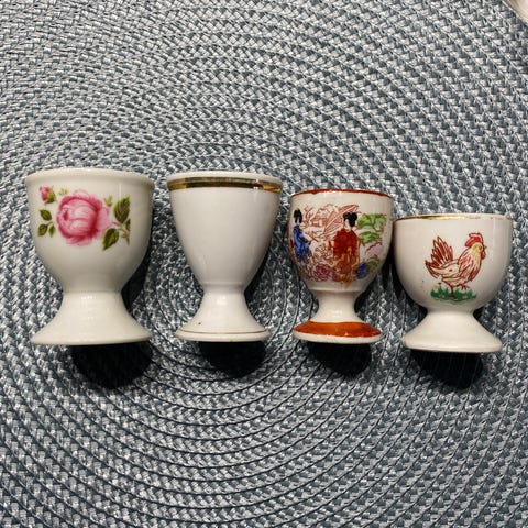 Äggkoppar i trä i naturfärg. Setet består av fyra äggkoppar med rund fot. Höjden framgår av bild med måttband. Några av äggkopparna har synliga sprickor i träet, vilket kan påverka utseende och funktion. Passar för servering av kokta ägg eller som liten hållare för mindre föremål i kök eller på frukostbord. Höjd ca 6,5 cm.