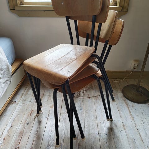Skolstolar trä och metall. 80 st eller alla fyra för 250kr.