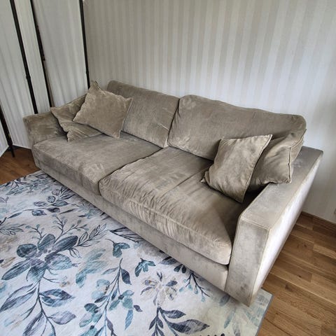 Soffan är ca 300 cm bred och tillsammans med två matchande fåtöljer blir det en komplett och lyxig sittgrupp som verkligen lyfter rummet.