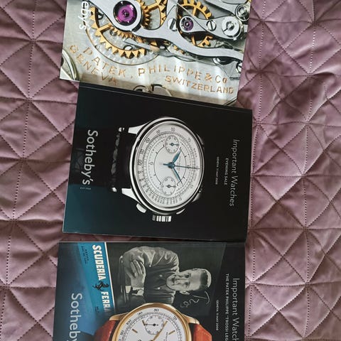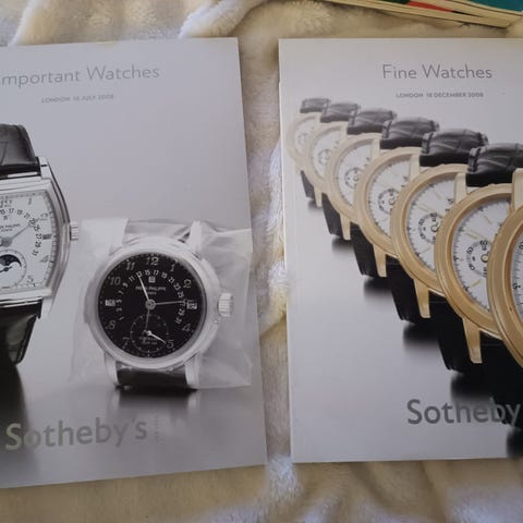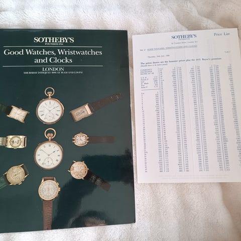 Sotheby’s Clocks and Watches Portrait Miniatures Gold Boxes Objects of Vertu Russian Works of Art and Fabergé bok. Auktionskatalog från Genève med fotografier och beskrivningar av klockor, ur, miniatyrporträtt, gulddosor, konstföremål och ryska konstverk inklusive Fabergé. Innehåller både färgbilder och textbeskrivningar av objekten.