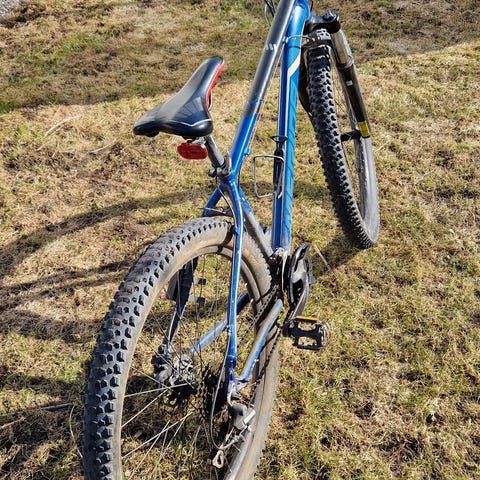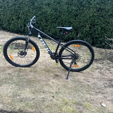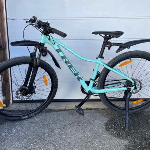 Trek mountainbike för unisex med ramstorlek S och 27,5" hjul. Cykeln har en turkos aluminiumram med rak framgaffel, skivbromsar och utanpåliggande växlar. Utrustad med platta pedaler, sadel anpassad för mountainbike och raka styren. Bakskärm och stöd är monterade för praktisk användning i vardagscykling. Passar för stigcykling, pendling och fritidskörning på blandat underlag.