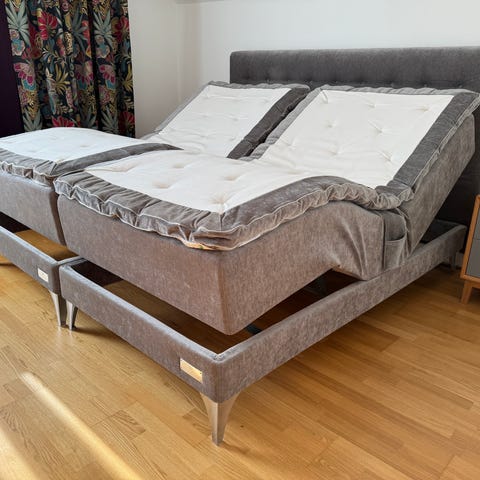Carpe Diem Beds kontinentalsäng i beige tygklädsel. Sängen består av två underdelar och en gemensam övermadrass. En sida är märkt med fasthetsgrad medel och den andra sidan med fasthetsgrad mjuk, vilket ger olika komfort på respektive sida. Sängen står på ljusa ben och har en matchande, rak sänggavel i samma tyg. Modellen heter Sandö och är 200 x 180. Sängen säljs komplett väldigt billigt Nypris 90000kr
