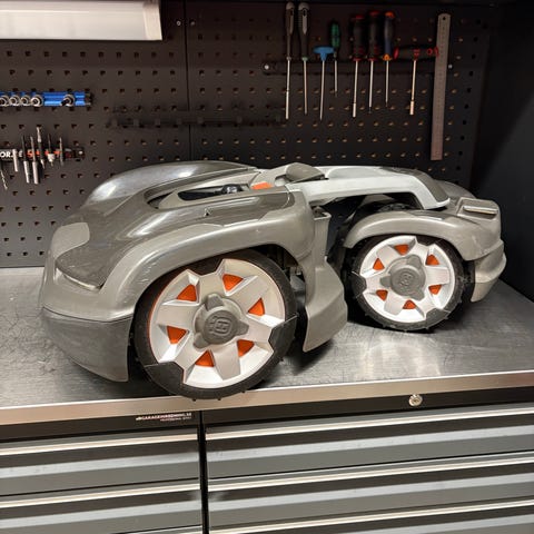 Gräsklippare med laddstation och hus från 2020 i väldigt bra skick. Klipparen har gått 3365 timmar och har servats till varje säsong. Det sitter terränghjul på den som vi köpte till eftersom tomten den gick på var kuperad. Originalhjulen följer med vid köpet.