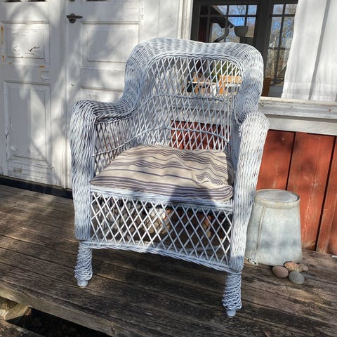 Stol i vitmålat trä med armstöd. Ryggstödet har utskurna detaljer och rak överkant. Sitsen är löstagbar och kan lätt kläs om. Det går även bra att köpa en av dem.