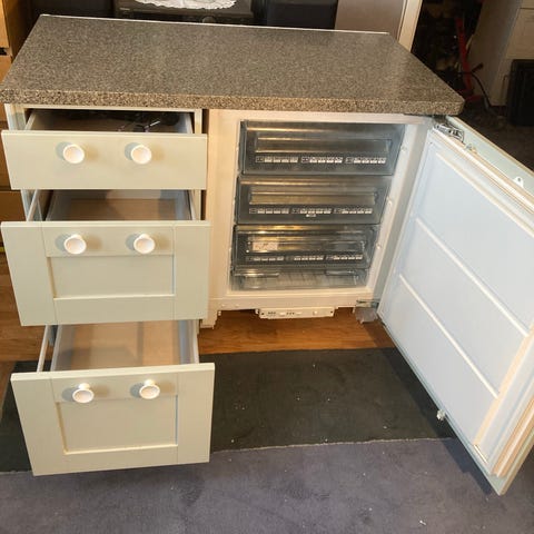 Frys inbyggnad AEG med skåp 3 lådor och fint granit skiva , Mått- bredd 105 cm , höjd 80-90 cm ,djup 60 cm / mycket bra kvalitét , bra fungerar ,Temperaturreglage och indikatorlampor sitter framtill i nederkant. Telefon 0735301468