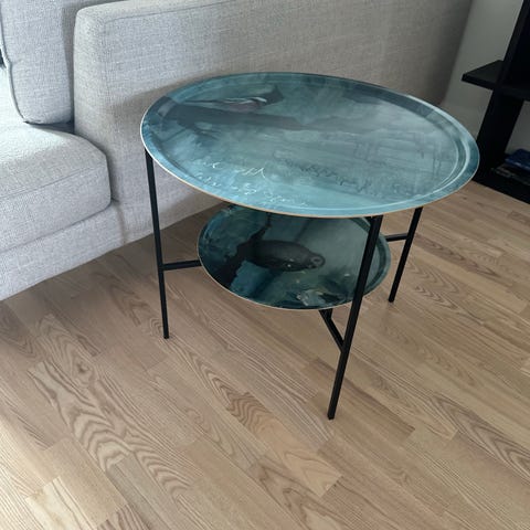 Ett runt bord med motiv av Carolina Gynning som är i gott skick. Brickan går att ta bort och benen går att fälla ihop. De specificerade måtten är ungefärliga och kan skilja med en eller två centimetern. Upphämtas i Linköping.