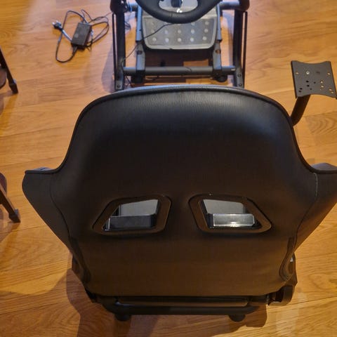 Logitech G29 racerratt med pedaler och racingsäte i svart och blått. Ratten är utformad för bilspel och har flera knappar samt växelpaddlar monterade på ratten. Pedalenheten har gas-, broms- och kopplingspedal. Racingsätet är i sportstolsmodell med konstläderklädsel i svart med blå detaljer och är monterat på en justerbar ställning som håller ratt och pedaler på plats. Utrustningen är avsedd för användning tillsammans med kompatibel spelkonsol eller dator för bil- och racingspel.