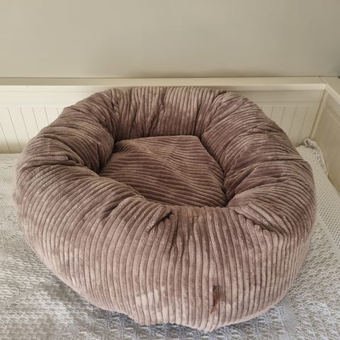 Hundkorg i flätat naturmaterial med löstagbar, mjukt vadderad innerkudde. Insidan är klädd med blommigt tyg i flera färger. Korgen är rektangulär och passar mindre hundar eller andra små husdjur. Lämplig som viloplats inomhus. Jag har även haft den i cykelkorg när taxen Bosse hängt med på cykelturer. Säljes pga flytt.