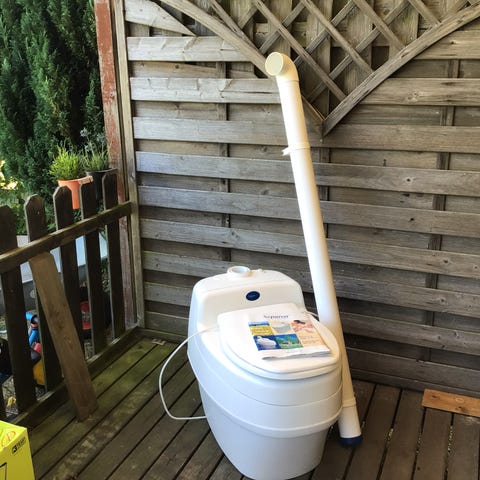 Separett toalett i vit plast. Toaletten har sits med lock och separat öppning framtill för anslutning. Passar exempelvis till fritidshus, gäststuga eller liknande där man behöver en enkel toalettlösning utan traditionell avloppsanslutning.