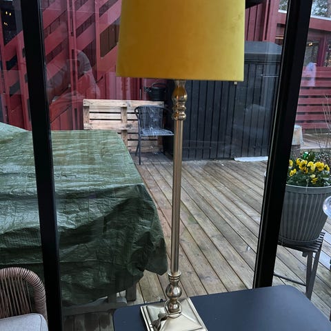 Fin haturfärgad lampa med guldfärgad stomme. Varmt ljus för vardagsrum eller sovrum, i gott skick