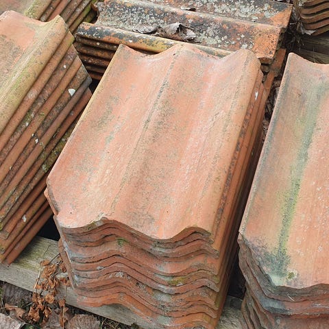Ca 350 tvålupigt (42*27 cm) lertegel från Vittinge, retro (10 kr st) Finns även 27 st nockpannor (60 kr/st). Även dessa från Vittinge.