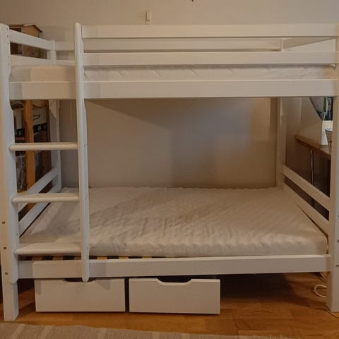 Säljer en våningssäng 120cm under och 90 i översängen. Sängen är vi i ett fint bruksskick skulle jag säga. Två lådor som passar under från samma tillverkare ingår. Fabrikatet är Erdal of Sweden.
