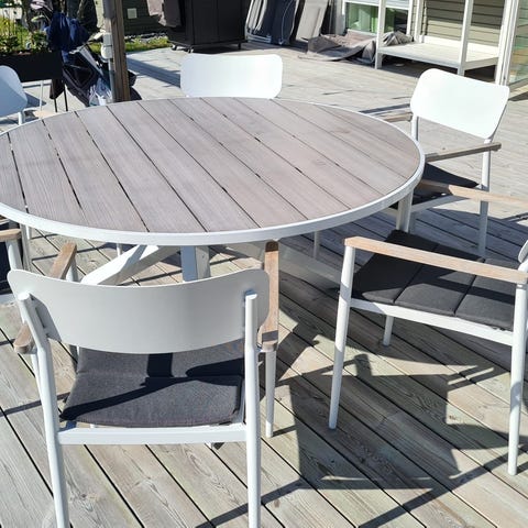Matgrupp utomhus runt bord med 6 stolar grå
