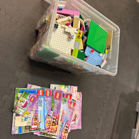 LEGO blandade byggklossar. Innehåller olika lösa delar och byggklossar i flera färger och former, för fri konstruktion och kreativ lek. Levereras i plastlådor enligt bild, där innehållet består av varierande LEGO-delar från olika teman.