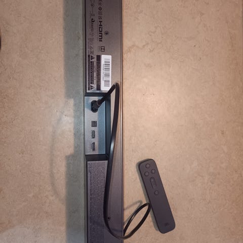 JVC soundbar i svart utförande. Lång, smal högtalare avsedd att placeras framför tv eller monteras på vägg. Utrustad med flera anslutningar på baksidan, bland annat HDMI‑ingångar, optisk ingång, analog ljudingång och nätanslutning. Stöd för Bluetooth och HDMI ARC enligt märkning på baksidan. Passar för användning tillsammans med tv, spelkonsol eller andra ljudkällor via kabel eller trådlös anslutning.