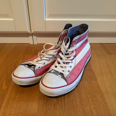 80-tals. All star basketball canvas hi. Str. 10 färg: dark earth. Made in U.S.A. skick: limningen har släpp längst fram i tåboxen mot sulan på båda, fullt användbara. Endast hämtning (Borlänge-Falun)