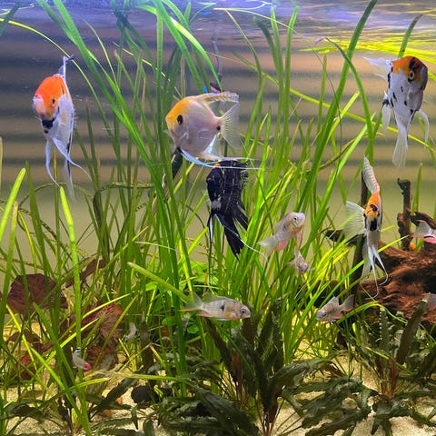 Skalar akvariefisk i olika storlekar och färgvarianter, främst orange och flerfärgad. Fisken hålls i sötvattensakvarium med sandbotten, rötter och levande växter. Passar för sällskapsakvarium tillsammans med andra fredliga arter som trivs i liknande vattenvärden. Bilderna visar ungefärlig färgteckning och kroppsform på fiskarna i gruppen.