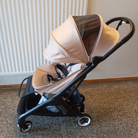 Vagnen har justerbart ryggstöd, fempunktssele och varukorg under sitsen. Framhjulen är svängbara och chassit är kompakt med små hjul, lämpligt för stadsmiljö och resor. Medföljer mugghållare från Bugaboo som kan fästas på handtaget för dryck eller flaska. Det ingår även regnskydd och myggnät.