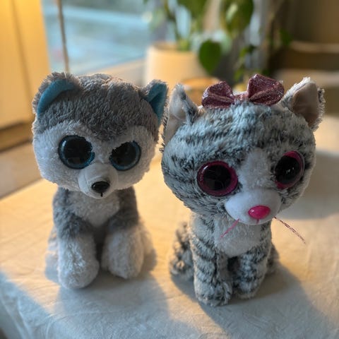 Ty gosedjur i form av blandade djur, inklusive katt, koala, hund, lejon och ett mindre runt djur.