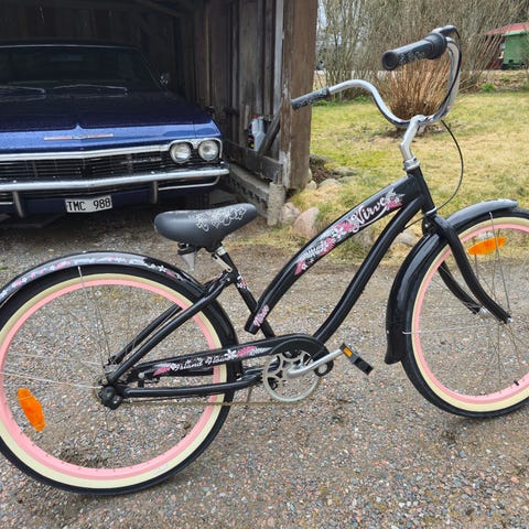 Barncykel med 26" hjul i svart färg. Utrustad med korg fram cykel lås, pakethållare bak och kedjeskydd. Cykeln har lågt insteg på ramen och sadel som kan höjdjusteras. Passar för äldre barn eller ungdomar som behöver en vardagscykel för exempelvis skola och fritid.