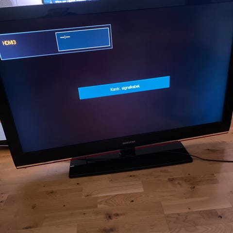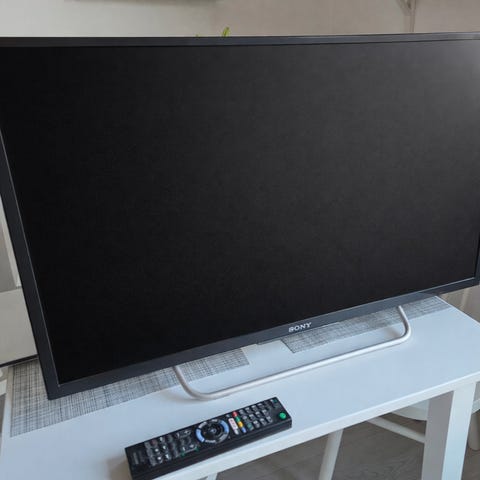 Sony TV med platt skärm. Modellen har anslutningar på baksidan för bland annat bild- och ljudkablar. TV:n står på ett stativ och fjärrkontroll ingår enligt bild.
