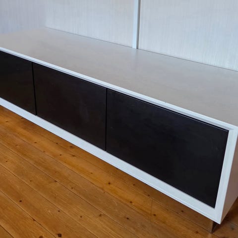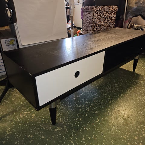 Svart/vit tv bänk. Liten skada på ena kanten (Se foto).