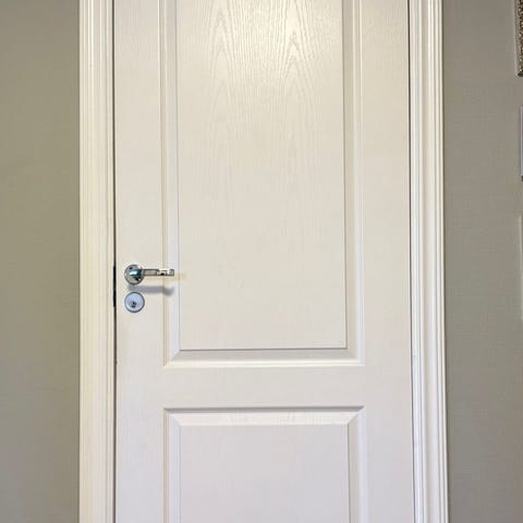 Swedoor innerdörr med glas med karm. Dörren har sex glasrutor i den övre delen och en slät spegel i den nedre delen. 9•21