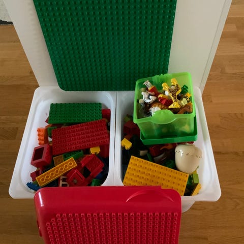 Lego Duplo klosslådor med byggplatta i plast, flerfärgad. Setet består av flera förvaringslådor formade som stora Lego Duplo-klossar i olika färger samt en grön byggplatta. Lådorna kan användas för förvaring av Duplo-klossar och tillbehör och fungerar samtidigt som lekytor.