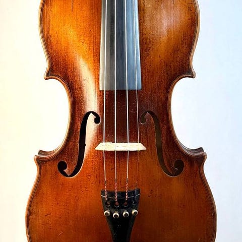 Fiol (4/4, 60cm) med trästråke och mjukt fodral. Instrumentet har mörk träfinish och traditionell utformning med fyra strängar, stämskruvar och hakstöd. Fodralet är vadderat invändigt och har plats för både fiol och stråke, samt bärremmar på utsidan för enklare transport.