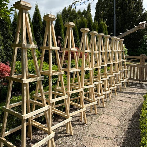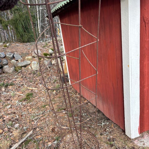 Växtstöd i metall i rostbrun färg. Cylindrisk modell med tre vertikala stag och flera runda ringar som ger stöd åt klängväxter eller buskar. Lämpligt för användning i trädgård eller rabatt för att hålla växter upprätta och ge dem något att klättra på.