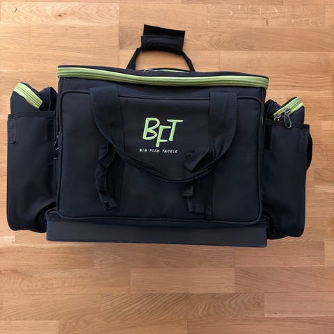 BAT fiskeväska med flera plastaskar och fack. Väskan är svart med gröna detaljer och bärhandtag. Invändigt finns lösa plastaskar med fackindelning för sortering av tillbehör, exempelvis beten, krokar eller smådelar. Passar för förvaring och transport av fiskeutrustning eller annat småplock där översiktlig organisering behövs.