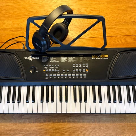 Gear4music MK-2000 keyboard i svart utförande. Elektroniskt tangentbord med inbyggda högtalare, display och flera förinställda ljud, rytmer och låtar enligt panelmärkningen. Utrustad med olika funktionsknappar för exempelvis ackompanjemang, tempo och ljudval. På bilderna syns även notställ och hörlurar samt stativ som kan ingå beroende på annonsens innehåll. Passar för hemmabruk, övning och enklare musikproduktion.