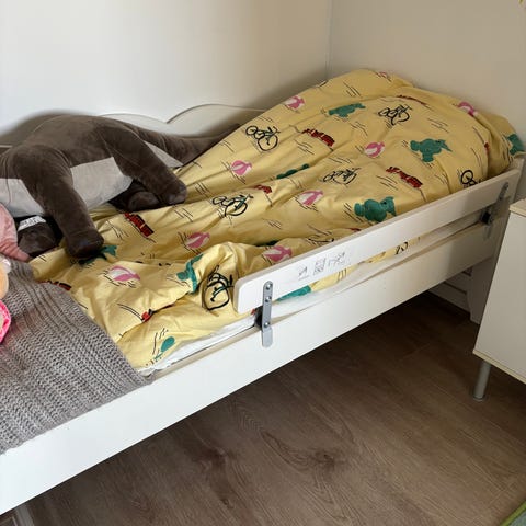 Vit utdragbar barnsäng. Antik, färgskav finns. Världens finaste säng! Ingår Ikea växamadrass. 80 cm bred och kan bli ca 190 lång.