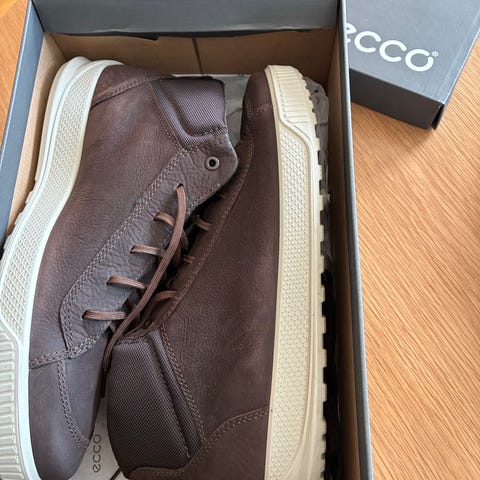 Ecco sneakers i storlek 38. Modellen är en svart, mellanhög sneaker i läder med snörning och vit sula. Skorna har en klassisk design som passar till vardagsbruk. Materialet är slätt läder utvändigt med textil- eller syntetfoder invändigt. Sulan är i gummi eller syntetmaterial för bra grepp vid normal användning.