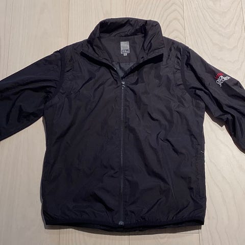 Tunnare, men fodrad svart herrjacka i storlek S. Innerfodret är orange. Resår nertill i midjan, på ärmarna samt upptill runt halsen. Fickor med dragkedja samt en ficka på vänster ärm. Även denna med dragkedja. Innerficka. Sparsamt använd och i fint skick.