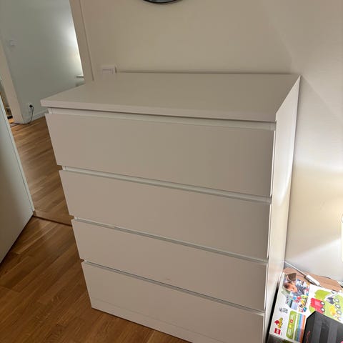 Säljer en klassisk MALM-byrå med 4 lådor. Byrån är i bra skick och har blivit väl omhändertagen – inga tråkiga repor på ovansidan och lådorna rullar precis så smidigt som de ska. Hålet på baksidan gjordes för vägguttag.