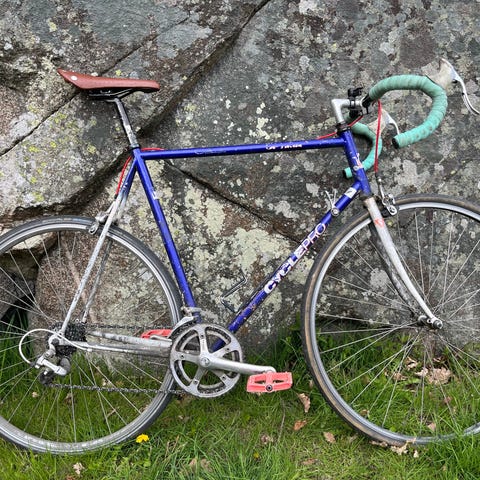 Peugeot barnracer. Makalöst liten. Fyra växlar. Jag fick den 1988 har jag för mig. Den är i bra skick, har förvarats inne sedan jag växte ur den. Däcken håller luft men rågummit har smulats sönder. Hela cykeln behöver smörjas upp efter att ha stått i 35 år. Den väger lite mer än man väntar sig, jämfört med moderna barncyklar.