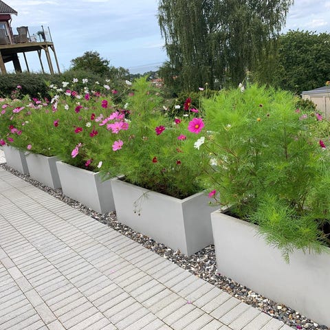 Rektangulär planteringslåda i grå metall. Lämplig för plantering av växter på altan, balkong eller i trädgård. Robust konstruktion med släta sidor och öppen ovankant. Passar för jord, växter och mindre buskar. Kan användas fristående eller flera tillsammans för att skapa avgränsningar eller rabatter. Svensk