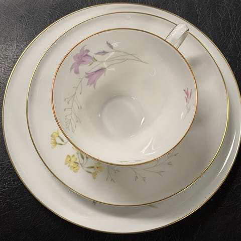 Kanon skick, mysig blommig servis med 11 koppar 11 fat och 11 assietter. Kaffekanna sockerskål och gräddkanna. Inga skador.