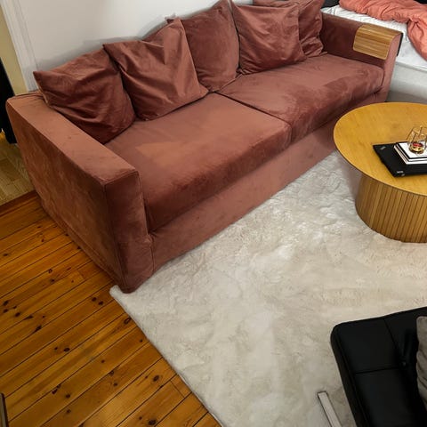 Beige 3-sits soffa i tyg. Soffan har raka armstöd och två ryggkuddar. Passar för vardagsrum eller liknande sällskapsyta. Neutralt utförande som fungerar i många olika inredningsstilar.