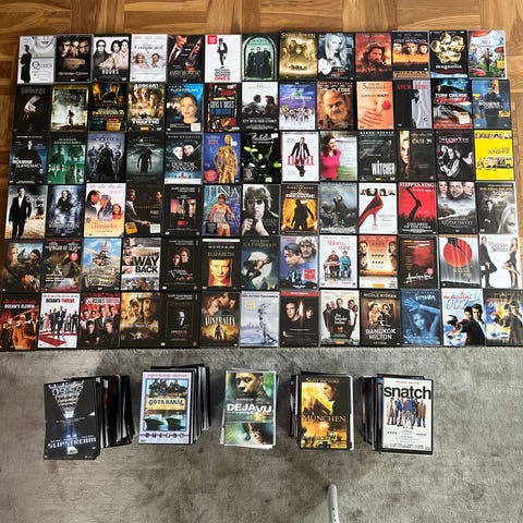En stor fin samling av DVD-filmer och serier. Samlingen innehåller en mängd olika titlar, inklusive populära serier som "Beck", "Wallander" och "CSI Miami", samt filmer som "Pirates of the Caribbean", "Kill Bill" och "V for Vendetta". Även boxar som "The Ultimate Western Collection" och "Final Battles World War II" ingår. En Sony DVD-spelare (DVP-SR760H) med HDMI-utgång medföljer.
