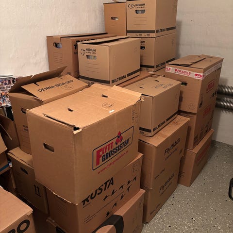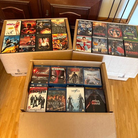 Tre stora fulla flyttkartonger med äldre dvd filmer och en halvfull kartong samt en dvd spelare .