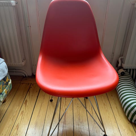 Vitra stol i tråddesign av metall i gul färg. Stolen har ett sits- och ryggstöd i nätkonstruktion samt underrede i metall med kryssformad fot. Passar som sittplats i vardagsrum, matplats eller hall. Sits och rygg är utformade i ett stycke för stöd och komfort. Metallkonstruktionen gör stolen lämplig för inomhusbruk i hem- eller kontorsmiljö.