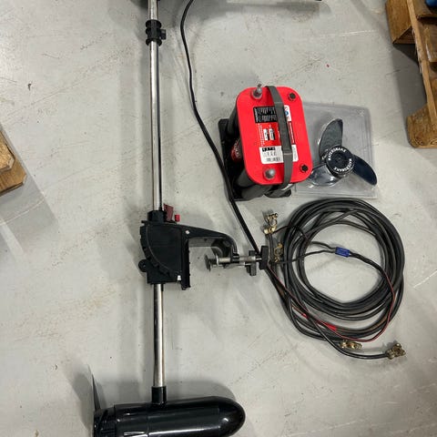 Elmotor med tillhörande batteribox säljes. Passar för montering på akterspegeln på mindre båtar.