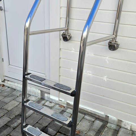 Badstege i rostfritt stål med två steg i trä. Ca 49,5 cm mellan skruvhål, 67-68 cm hög och djup ca 34,5. Säljes till högstbjudande, ge bud!