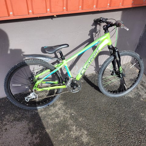 Moutainbike barncykel med 24" hjul, handbromsar och 18 växlar. Utrustad med grovmönstrade däck som passar för både grus- och asfaltsunderlag. Passar barn som behöver en något större barncykel med 24-tums hjulstorlek. 500kr/cykel. Hämtas i Svedmyra