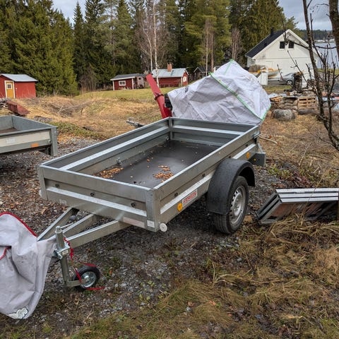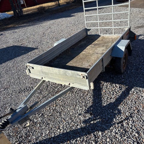 Släpvagn öppen lastsläpvagn i grå metall med en plan lastyta. Utrustad med en axel och hjulskärmar samt drag för bilkoppling. Flak med släta sidor och främre gallerplåt som skydd mot last. Passar för transport av exempelvis byggmaterial, trädgårdsavfall eller annan skrymmande last.