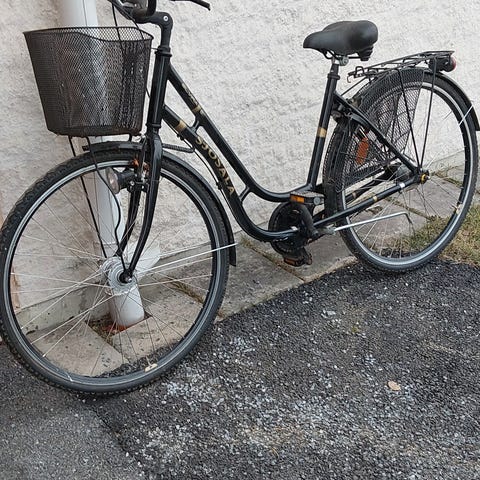 Cykelkorg och lastkorg bak ingår. 5 växlar. Lås med nyckel.