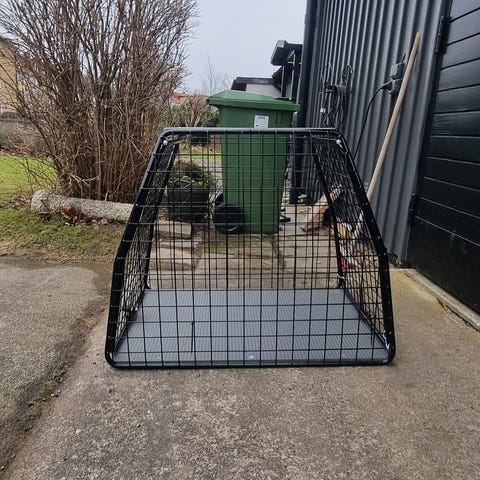 Hundbur för bil i svart metallnät från Artfex, stl medium. Utrustad med dörr framtill med lås, nycklar finns. Evakueringslucka baktill. Helt skrammelfri.